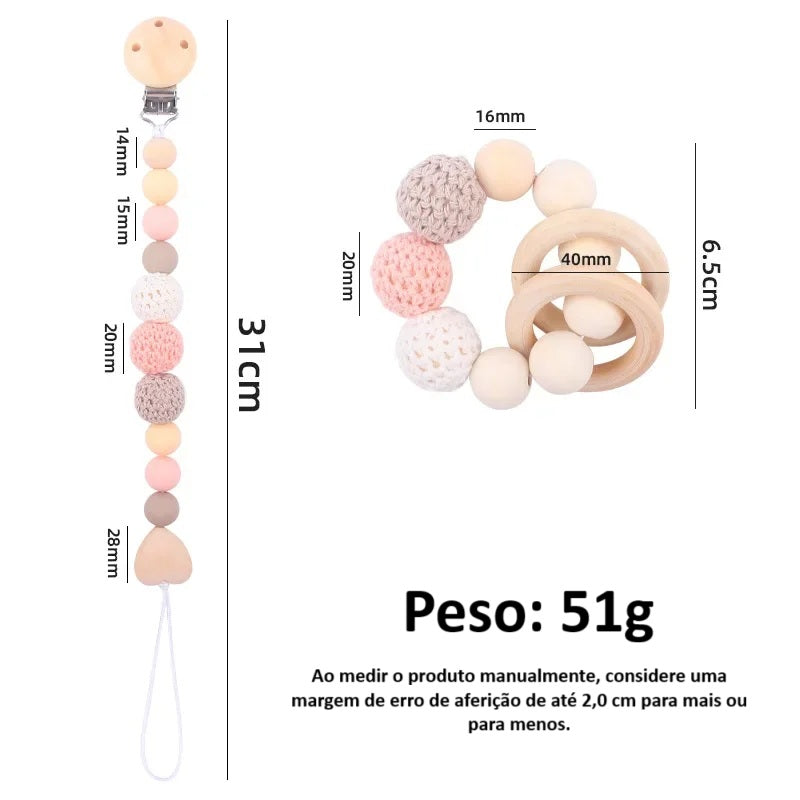 - Peso: aproximadamente 51g (31g corrente da chupeta, 20g pulseira mordedor